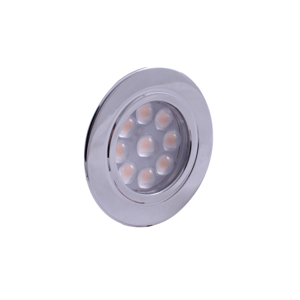 Dimatec recessed mini 12V downlight with 9 surface mounted LEDs (0.6W). This 45mm diameter flush fitting, recessed light has a chrome finish and a warm white light output and is suitable for use in motorhomes, vans, campervans, caravans, boats etc.